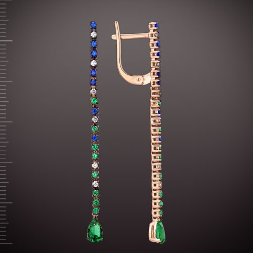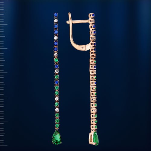 Серьги выполнены по уникальной технологии - золотая дорожка, в которой золотыми крапанами закреплены камни, может свободно гнуться влево и вправо, вперед и назад - то есть, во время ношения серег при дижении, серьги свободно раскачиваются, тем самым позволяя камням сверкать еще больше!