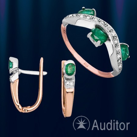 Гарнитур из русского красного золота 585°, комбинированного с белым. Состоит из кольца FYZ0024 со вставками изумруда и 18-ю бриллиантами 0,13 карата и серег FYP0020 с 2-я бриллиантами 0,03 карата и изумруда. Серьги с английским замком- простым, надежным и долговечным. Покупая данные изделия в наборе, вы экономите 15€