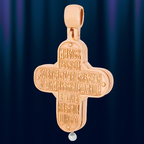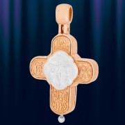 Крест-мощевик с распятием из серебра 925 пробы, позолоченный. Высота 45 мм. Мощевик — общее название ёмкостей для хранения частиц мощей. Малые частицы мощей при помещении в мощевик заливаются воскомастикой, предохраняющей их от выпадения или повреждения. Предполагается, что мощевики наделены серьезной защитной и оберегающей силой.