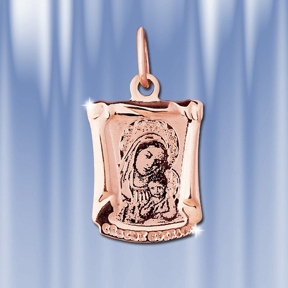 Образок нательный из русского золота 585°с изображение Божией Матери с Младенцем Иисусом. На обратной стороне надпись "Спаси и сохрани". Высота подвески с ушком 25 мм. Ширина: 13 мм