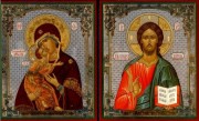 Очень красивая и сильная  икона- складень, тисненная золотом и серебром. На левой иконе изображена Пресвятая    Богородица Владимирская  с младенцем Иисусом.  На правой иконе  изображен Всемогущий Господь наш Иисус-Христос Пантократор.