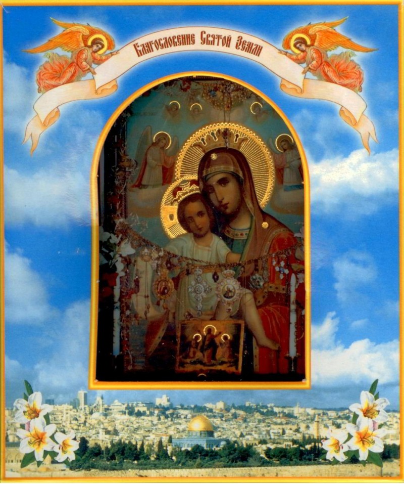 Икона находится в подарочной картонной упаковке с видом на Иерусалим. Размеры вместе с рамкой : Высота около 155 мм, ширина около 133 мм, толщина 22 мм. На этой иконе вмонтирована капсула с частицей земли из Гефсимании. Икона освящена Святой Богоявленской водой из реки Иордан. На задней части Иконы имеется металлическая петля для крепления иконы на стену.