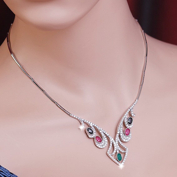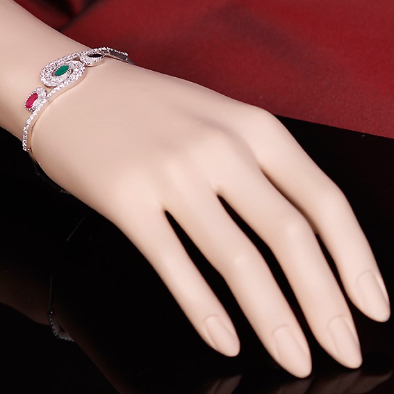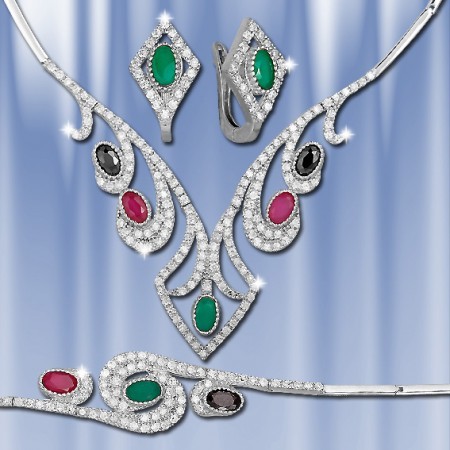 Красивый серебряный гарнитур со вставками рубина, изумруда, чёрного опала и бесцветных цирконов. Гарнитур состоит из колье 45 см., браслета 19 см. и серёг. В наличии есть серьги с изумрудом, рубином, а так же с чёрным опалом. Высота серёг 20 мм., ширина 10 мм. Серьги с английским замком - простым, надежным и долговечным. Украшения прекрасно подчеркнут нежность, очарование и естественность Вашей красоты. Гарнитур продаётся в подарочной упаковке.