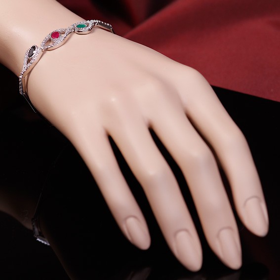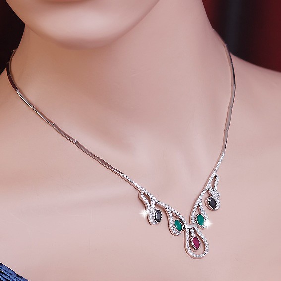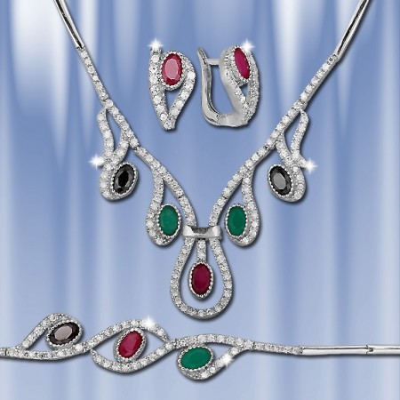 Красивый серебряный гарнитур со вставками рубина, изумруда, чёрного опала и бесцветных цирконов. Гарнитур состоит из колье 45 см., браслета 18,5 см. и серёг. В наличии есть серьги с изумрудом, рубином, а так же с чёрным опалом. Высота серёг 15 мм., ширина 10 мм. Серьги с английским замком - простым, надежным и долговечным. Украшения прекрасно подчеркнут нежность, очарование и естественность Вашей красоты. Гарнитур продаётся в подарочной упаковке.
