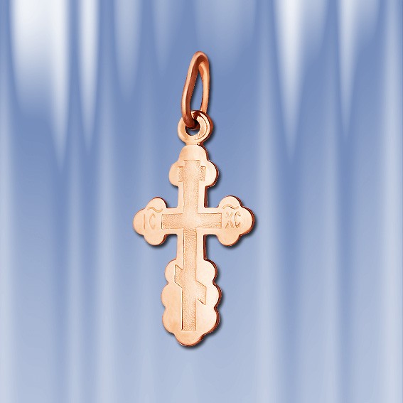 Kreuzanhaenger für Kinder aus russischem Gold 585° mit graviertem Muster. Auf der Rückseite des Kreuzes ist ein Schutzgebet „Rettet und bewahrt“ eingraviert. Oben am Kreuz befindet sich ein Ring für eine Kordel oder Kette. Kratzt nicht beim Tragen.