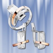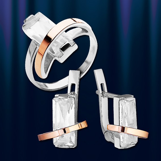 Изящный ювелирный гарнитур выполнен из серебра 875 пробы со вставками из красного русского золота 585 пробы, а так же украшен сврекающим фианитом.