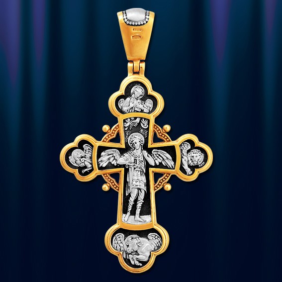 В центре оборота креста изображен Архистратиг Михаил. Могучий Архангел почитается как покровитель воинов и всех верных Богу и ведущих борьбу против сил зла, а также защитник душ умерших, страж райских врат. Над ним изображена благословляющая десница – знак присутствия Бога. Вокруг символы четырех евангелистов: орел (Иоанн), лев (Марк), телец (Лука) и ангел (Матфей).