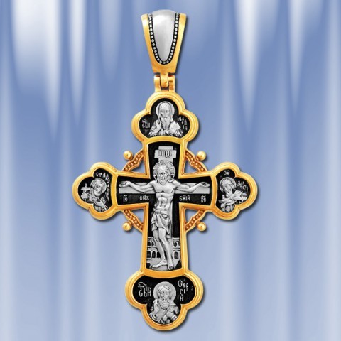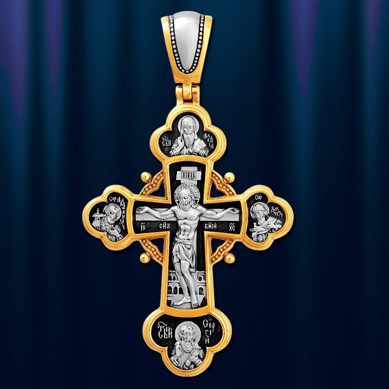 На лицевой стороне креста в центре по традиции находится Распятие Господа Иисуса Христа. Слева от Господа изображен святой благоверный князь Александр Невский (1221–1263), справа – святой благоверный князь Димитрий Донской (1350–1389). Святые князья почитаются как покровители воинов и защитники от врагов телесных и душевных.