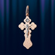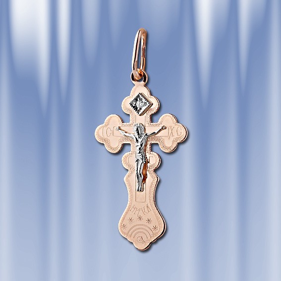 Золотой нательный крест из русского красного золота украшен бриллиантом 0,01 карата. На основании, с алмазной гранью , закреплена отдельно выполненная из белого золота фигурка Христа. В верхней части креста имеется колечко для цепочки. На задней части креста имеется надпись "Спаси и Сохрани". Длина крестика с ушком около 30 мм., ширина около 14 мм. Золото 585 пробы.