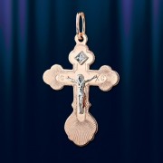 Золотой нательный крест из русского красного золота украшен бриллиантом 0,01 карата. На основании, с алмазной гранью , закреплена отдельно выполненная из белого золота фигурка Христа. В верхней части креста имеется колечко для цепочки. На задней части креста имеется надпись "Спаси и Сохрани". Длина крестика с ушком около 31 мм., ширина около 19 мм. Золото 585 пробы.