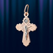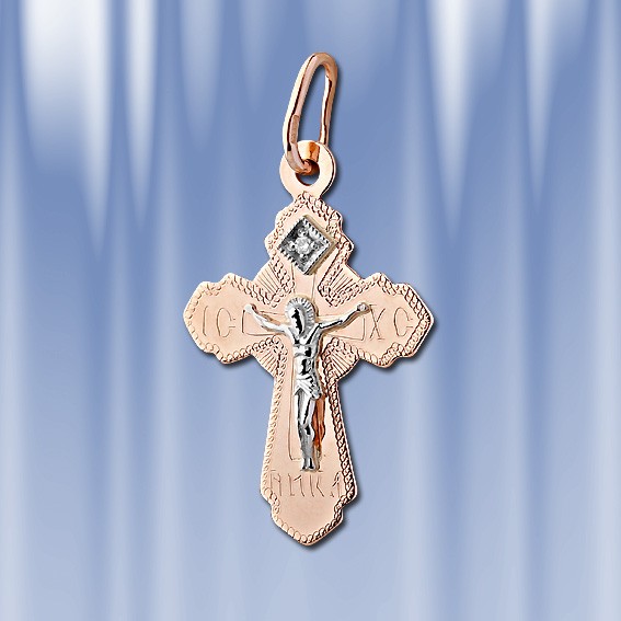 Золотой нательный крест из русского красного золота украшен бриллиантом 0,01 карата. На основании, с алмазной гранью , закреплена отдельно выполненная из белого золота фигурка Христа. В верхней части креста имеется колечко для цепочки. На задней части креста имеется надпись "Спаси и Сохрани". Длина крестика с ушком около 27 мм., ширина около 15 мм. Золото 585 пробы.