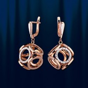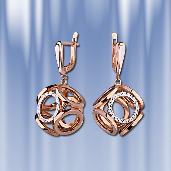 Стильные серьги-подвески из русского красного золота 585°, комбинированного с белым. Высота около 33 мм. Ширина около 15 мм. Серьги с английским замком, простым, надежным и долговечным.