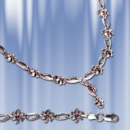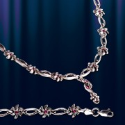 Красивый гарнитур со вставками рубина из чернёного серебра 925°. Набор состоит из колье 45 см. и браслета 19 см. Диаметр цветка пр.9 мм. Украшения прекрасно подчеркнут нежность, очарование и естественность Вашей красоты.