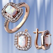Гарнитур из русского красного золота 585 пробы с опалом и бесцветными цирконами. Набор состоит из кольца и серег с английским замком- простым, надежным и долговечным. Высота пр.14 мм.,ширина пр.11 мм
