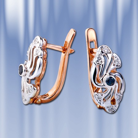 Элегантные серьги из белого и красного золота 585 пробы со вставками очаровательных бриллиантов и сапфиров.