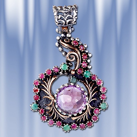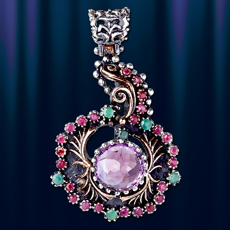 Стильное и роскошное украшение - кулон с большой вставкой аметиста, который красиво обрамляют натуральные  рубины и изумруды. Ручная работа, в единственном экземпляре. Серебро 925 пробы. Высота 55 мм., ширина 30 мм
