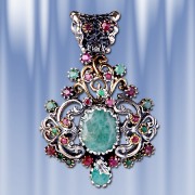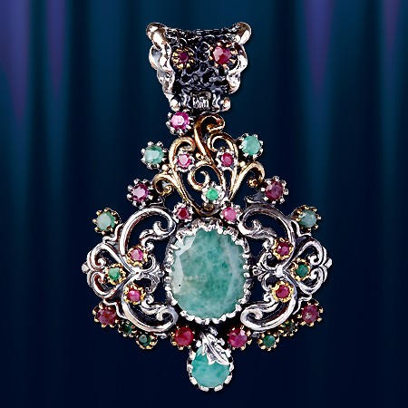 Стильное и роскошное украшение - кулон с большой вставкой изумруда, который красиво обрамляет россыпь рубинов и изумрудов. Ручная работа в единственном экземпляре. Серебро 925 пробы. Высота 55 мм., ширина 40 мм