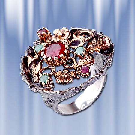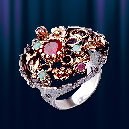 Эксклюзивное кольцо ручной работы из чернёного серебра 925 пробы украшенное натуральными рубинами, изумрудами. Позолоченное. Кольцо, в котором чувствуется дух роскоши и элегантности, аристократизма и величия.
