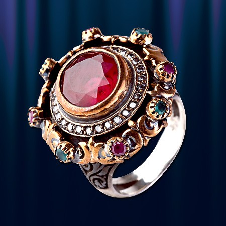 Эксклюзивное кольцо ручной работы из чернёного серебра 925 пробы украшенное крупной вставкой из натурального рубина, а так же  изумрудами, рубинами и цирконами. Кольцо, в котором чувствуется дух роскоши и элегантности, аристократизма и величия.
