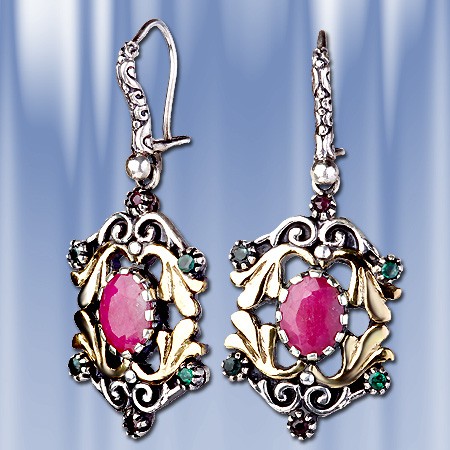 Серьги-подвески, ручной работы, выполненные из чернёного серебра 925°. Вставки: рубин, изумруд. Высота пр.45 мм., ширина пр. 20 мм.  Серьги с французским замком - простым, надежным и долговечным.