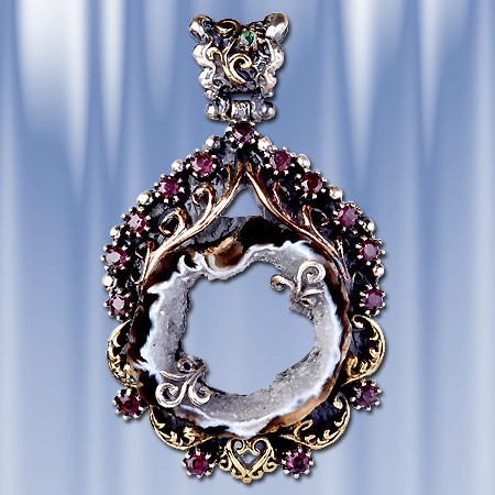 Стильное и роскошное украшение - кулон, ручной работы, в единственном экземпляре.  Вставки: рубины и изумруды. Чернёное серебро 925 пробы. Высота 60 мм., ширина 35 мм