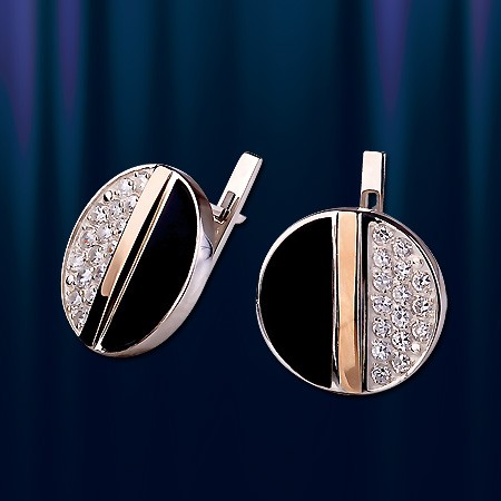 Ohrringe aus Silber 875° & Gold 375° mit Onyx, Zirkon. Durchmesser ca.19 mm.