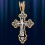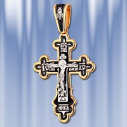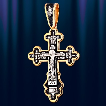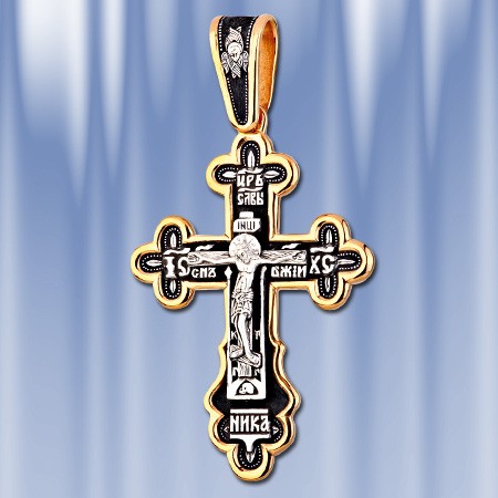 позолотой 999 пробы 5 микрон. Примерные размеры - высота крестика с ушком 77 мм, ширина 42 мм, толщина 2,5 мм. Размер ушка под цепочку - 18 х 10 мм. На лицевой стороне креста изображено Распятие Господа нашего Иисуса Христа. На обороте – короткая молитва, обращенная к Господу, которая традиционно помещается на нательных крестах: