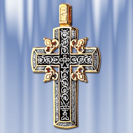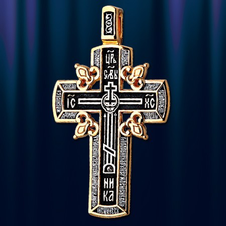 Голгофский крест символизирует Распятого на Голгофе Господа Иисуса Христа. Полукруглая цата на средокрестии символизирует царское достоинство Господа и Его терновый венец. С двух сторон по периметру креста написаны слова Канона святому и животворящему Кресту Господню. На лицевой стороне: «Кресте всесильне, апостолов похвала, преподобных утверждение, и верных знамение, и иерархов и мучеников слава, победа и утверждение всех хвалящих тя». На обороте: «Кресте Честный, хранитель души и тела буди ми, образом своим бесы низлагая, враги отгоняя, страсти упраждняя, и благословение даруя ми, и жизнь и силу, содействием Святаго Духа».