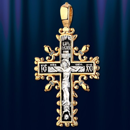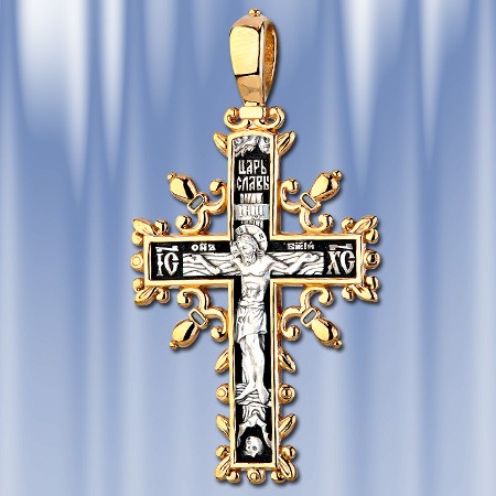позолотой 999 пробы 5 микрон. Примерные размеры - высота крестика с ушком 62 мм, ширина 33 мм, толщина 1 мм. Размер ушка под цепочку - 10 х 4 мм.