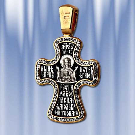 На лицевой стороне креста изображено Распятие Господа нашего Иисуса Христа. На обороте помещен образ Божией Матери «Знамение», прославившийся многими чудесами в Новгороде в XII веке. Икона эта чтится как одна из самых великих чудесами в Новгороде в XII веке. святынь Русской земли. Молитвенно воздетые руки Богородицы означают заступничество за людей пред Богом, молитву за мир. Вокруг образа написана молитва Богородице: «Ныне к Тебе прибегаю, Пречистая Дево, спаси мя мольбами Твоими».