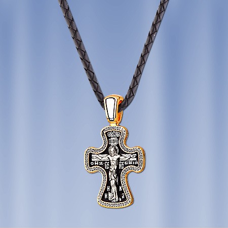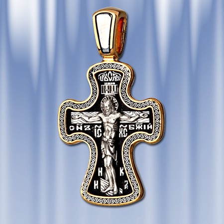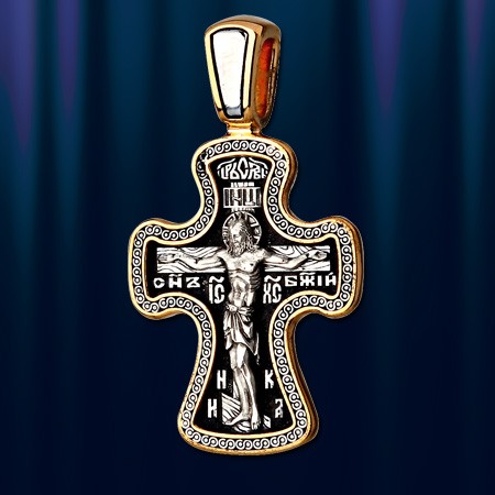 позолотой 999 пробы 5 микрон. Примерные размеры - высота крестика с ушком 41 мм, ширина 23 мм, толщина 2 мм. Размер ушка под цепочку - 10 х 6 мм.