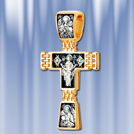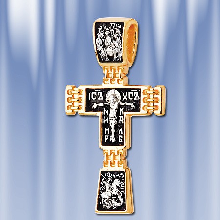 На лицевой стороне креста изображено Распятие Господа Иисуса Христа. Вверху – образ Святой Троицы, на котором запечатлено явление Триединого Бога праотцу Аврааму в виде трех ангелов. В нижнем клейме изображено Чудо св. Георгия о змие. Великомученик Георгий почитается как покровитель воинов, защитник от злых сил, помощник в духовной борьбе. На обороте в центре помещена икона Покрова Пресвятой Богородицы, образ молитвенного покрова Богородицы над людьми, и поклоняющиеся Ей Архангелы Михаил и Гавриил.