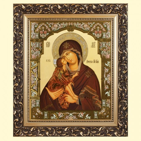 Икона Пресвятой Богородицы Донская. Русская Православная Икона двойного тиснения "золотыми" и "серебряными" красками в деревянной узорчатой раме. Приблизительные размеры рамы: Ширина 6,0 см, толщина 3,5 см. На задней стороне иконы закреплена металлическая петля, для крепления иконы на стену. Икона освящена настоятелем храма Преподобного Серафима Саровского в п. Софрино.