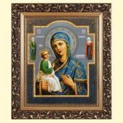 Русская Православная Икона Иерусалимской Богородицы двойного тиснения "золотыми" и "серебряными" красками в деревянной узорчатой раме. Приблизительные размеры рамы: Ширина 6,0 см, толщина 3,5 см.