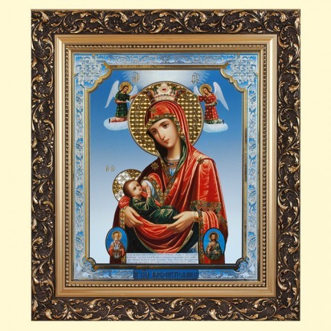 Икона Пресвятой Богородицы Млекопитательницы. Русская Православная Икона двойного тиснения "золотыми" и "серебряными" красками в деревянной узорчатой раме. Приблизительные размеры рамы: Ширина 6,0 см, толщина 3,5 см. На задней стороне иконы закреплена металлическая петля, для крепления иконы на стену. Икона освящена настоятелем храма Преподобного Серафима Саровского в п. Софрино.