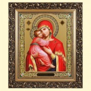 Икона Пресвятой Богородицы Владимирской. Русская Православная Икона двойного тиснения "золотыми" и "серебряными" красками в деревянной узорчатой раме. Приблизительные размеры рамы: Ширина 6,0 см, толщина 3,5 см. На задней стороне иконы закреплена металлическая петля, для крепления иконы на стену. Икона освящена настоятелем храма Преподобного Серафима Саровского в п. Софрино.