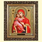 Икона Пресвятой Богородицы Владимирской. Русская Православная Икона двойного тиснения "золотыми" и "серебряными" красками в деревянной узорчатой раме. Приблизительные размеры рамы: Ширина 6,0 см,  толщина 3,5 см. На задней стороне иконы закреплена металлическая петля, для крепления иконы на стену. Икона освящена настоятелем храма Преподобного Серафима Саровского в п. Софрино.