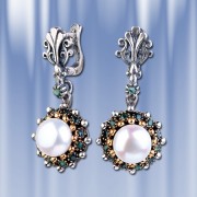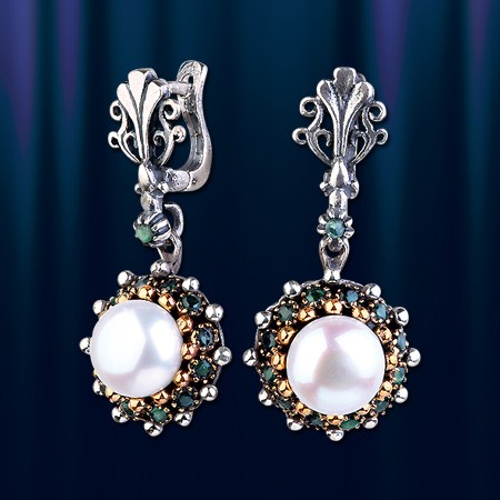 Серьги из чернёного серебра 925° с жумчугом (диаметр пр. 10,0 мм), изумрудом. Длина пр. 40,0  мм.