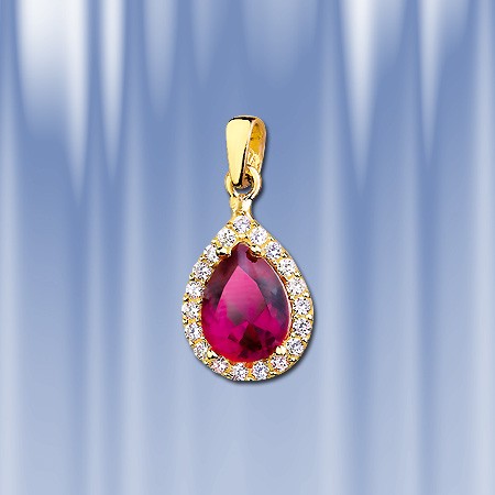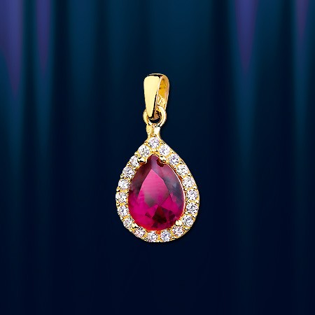 Подвеска выполнена из  жёлтого золота 585°, украшена синтетическим рубином (8 х 6) мм и цирконом. Высота подвески с ушком пр.18 мм