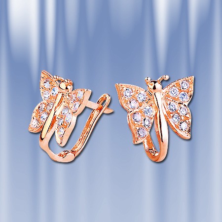 Серьги выполнены из красного  русского золота в форме бабочки. Вставки:  циркон. Серьги с английским замком - надежным и долговечным. Золото 585 пробы. Высота пр. 12 мм. ширина пр. 12 мм
