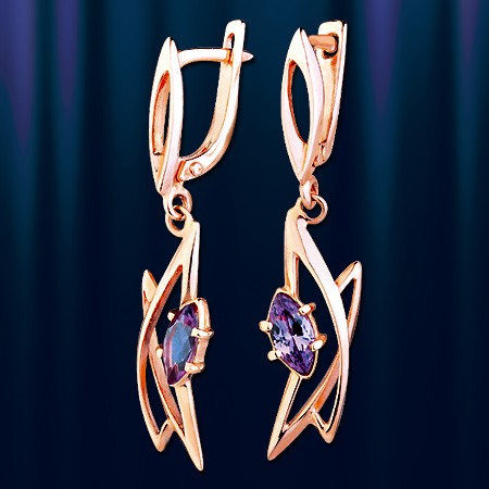 Серьги-подвески выполнены из красного  русского золота 585° с  аметистом (7 х 3)мм. Высота пр.35 мм. Ширина пр. 10 мм.