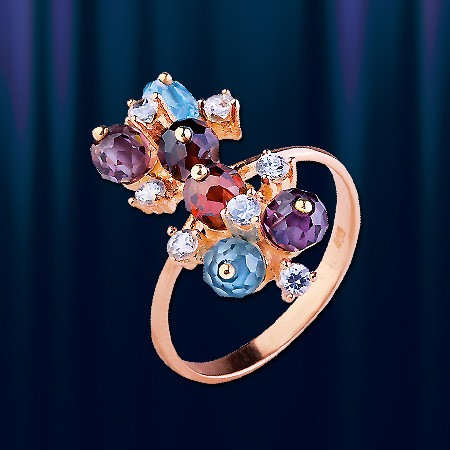 Кольцо из русского красного золота 585°. Вставки: аметист (5х5мм), топаз(5х5мм), гранат(5х5мм)и цирконий(2х2мм). Это кольцо покорит Вас своей красотой и блеском, поможет Вам почувствовать себя неотразимой.