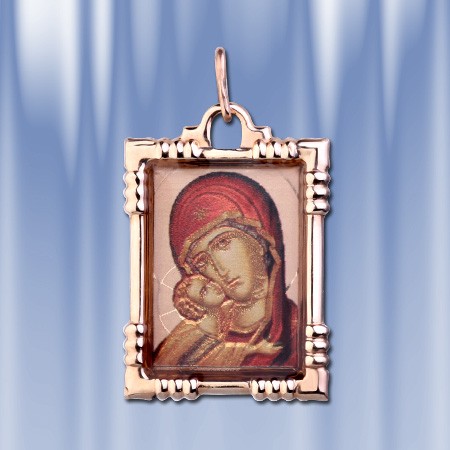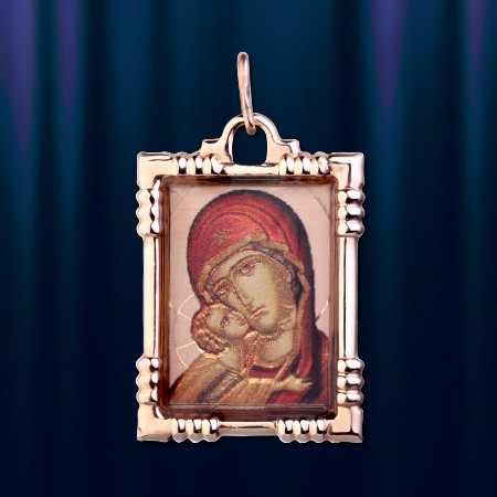 красного золота 585°. На основании подвески гравировано изображение Божией Матери с Младенцем Иисусом. На обраной стороне подвески надпись : "Пресвятая Богородица спаси нас!". Высота с ушком пр.35 мм. Ширина: 20 мм.