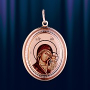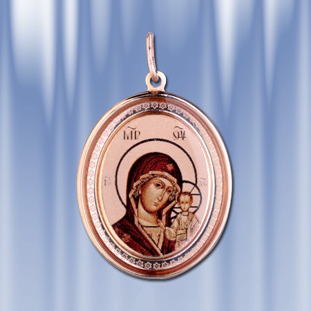 русского золота 585°. На основании подвески гравировано изображение Божией Матери с Младенцем Иисусом. На обраной стороне подвески надпись: "Пресвятая Богородица спаси нас!". Высота с ушком пр.35 мм. Ширина: 22 мм.