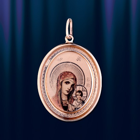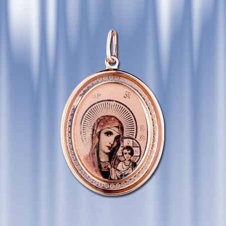 Икона Божей Матери Казанская нательная из русского золота 585°. На основании подвески гравировано изображение Божией Матери с Младенцем Иисусом. На обраной стороне подвески надпись: "Пресвятая Богородица спаси нас!". Высота с ушком пр.35 мм. Ширина: 22 мм.
