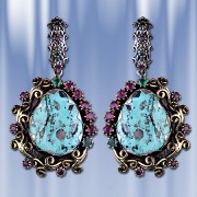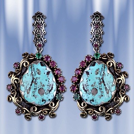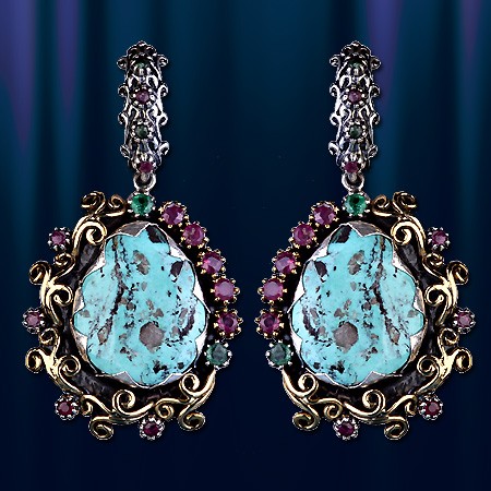 Серьги-подвески, ручной работы, выполненные из чернёного серебра 925°. Вставки: иранская бирюза (22 х 18 мм), 11 рубинов, 4 изумруда. Высота пр.50 мм., ширина пр. 30 мм.  Серьги с английским замком - простым, надежным и долговечным.