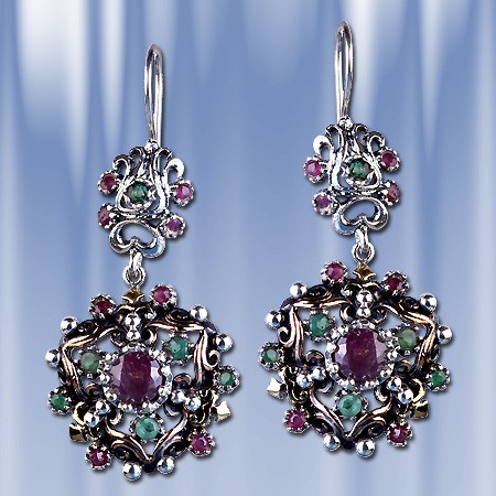 Серьги-подвески, ручной работы, выполненные из чернёного серебра 925°. Вставки: рубин (диаметр 6 мм), 8 рубинов (диаметр 2 мм), 6 изумрудов (диаметр 2 мм). Высота пр.50 мм., ширина пр. 20 мм.  Серьги с французским замком - простым, надежным и долговечным.