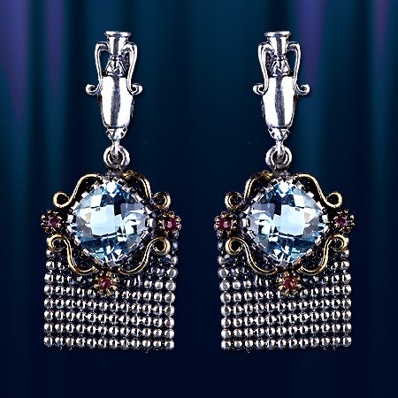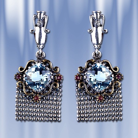 Серьги-подвески, ручной работы, выполненные из чернёного серебра 925°. Вставки: топаз (12 х 12 мм), 3 рубина (диаметр 2 мм).  Высота пр.40 мм., ширина пр. 18 мм.  Серьги с английским замком - простым, надежным и долговечным.