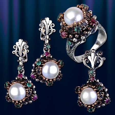 Гарнитур ручной работы из чернёного серебра 925 пробы с жемчугом  (диаметр 10 мм), рубинами  (диаметр 2,5 мм) и изумрудами (диаметр 2,5 мм). Набор состоит из подвески, кольца и серёг с английским  замком. Высота подвески пр.35 мм., ширина пр.20 мм. Высота серёг пр.37 мм., ширина 20 мм.