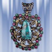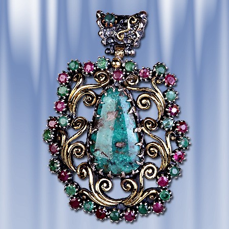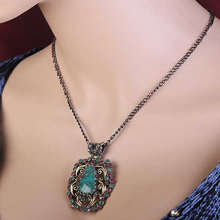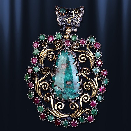 бирюзы (25 х 15 мм), которую красиво обрамляют 17 рубинов (диаметр 3 мм) и 18 изумрудов (диаметр 3 мм). Серебро чернёное 925 пробы,